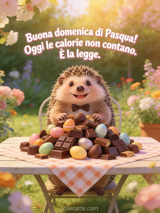 Condividi una risata questa domenica di Pasqua con questo biglietto comico con un adorabile riccio seduto beato davanti a un'enorme montagna di cioccolatini e uova di Pasqua. Scopri anche un biglietto di domenica di Pasqua, auguri di lunedì di Pasqua o bella immagine di weekend di Pasqua.