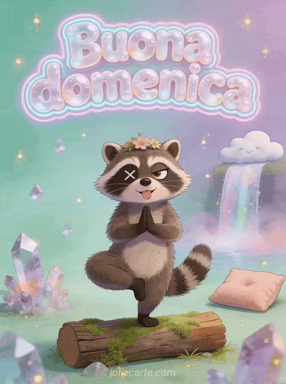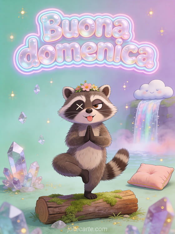 Invia un saluto divertente di buona domenica con lettere a bolle rimbalzanti e un procione buffo che fa pose di yoga su un tronco in una scena di benessere ridicola. Scopri anche augurare una buona domenica, buona domenica di giugno o buona domenica amicizia immagini.