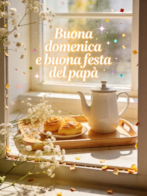 Augura a papà una buona domenica e buona festa del papà con un vassoio da colazione realistico, una caffettiera in porcellana, pasticceria dorata e rametti ariosi di gipsofila che si sovrappongono al bordo dell'immagine. Questo biglietto è fresco, invitante e festoso. Scopri anche felice festa del papà amore mio, testo d'amore per la Festa del Papà o biglietto cravatta festa del papà.