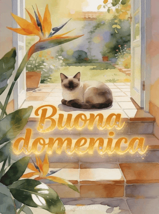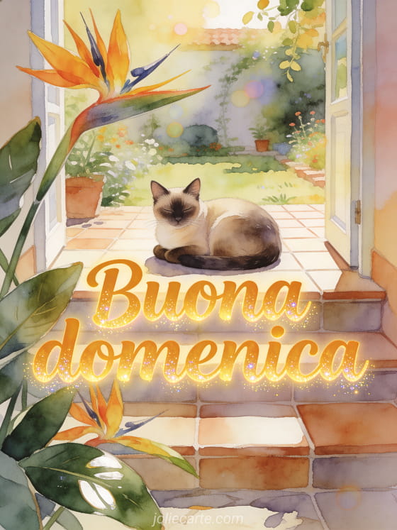 Condividi una buona domenica con un gatto siamese accoccolato su un gradino del giardino, tra strelitzie e luce calda ad acquerello. Invia questo pensiero tenero e scopri anche buona domenica biglietto gratuito, immagini di buona domenica o immagine animata di buona domenica.
