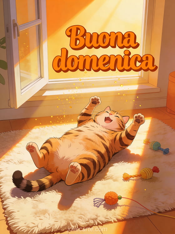 Condividi un saluto divertente di domenica con un gatto tigrato paffuto sdraiato a pancia in su in un raggio dorato di sole, zampe in aria, giochi intorno e felicità totale. Puoi anche inviare buona domenica caffè gif o buona domenica gif divertente.