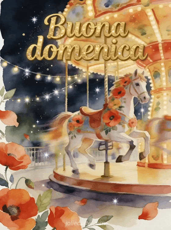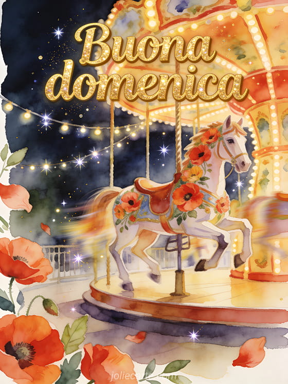 Condividi una buona domenica scintillante con un cavallo da giostra decorato con papaveri vivaci, fili di luci e movimento gioioso ad acquerello. Scopri anche una bella immagine gratis buona domenica, un bel testo buona domenica o un buona domenica cuore gif.