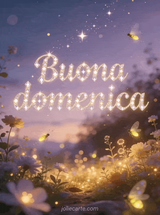 Invia un saluto magico di buona domenica con scritta di diamante scintillante, stelle che brillano e un giardino incantato illuminato dalle lucciole al crepuscolo. Scopri anche buongiorno buona domenica buongiorno buona giornata, buongiorno buona domenica e buona giornata o buona domenica fredda immagini.