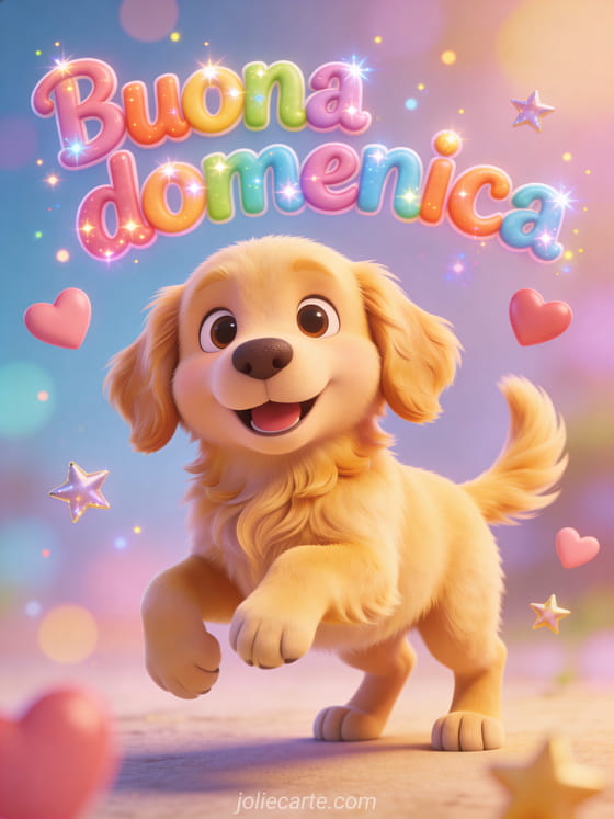 Condividi una gif animata di buona domenica con scritte colorate, un carino cucciolo di golden retriever che scodinzola, cuori fluttuanti e stelle brillanti. Scopri anche una buona domenica bella cartolina o una buona domenica sotto la pioggia umorismo.