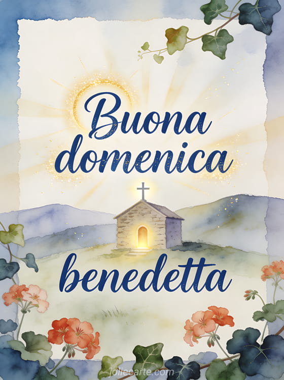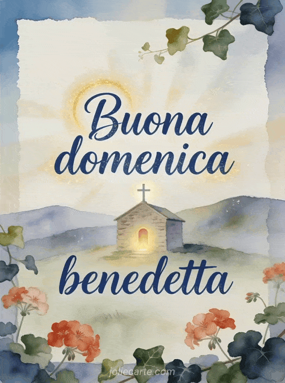 Invia una benedizione serena della domenica con calligrafia blu profondo, una piccola cappella in pietra, una croce luminosa, colline tranquille, gerani e foglie di edera. Scopri anche biglietti per augurare buona domenica, una buona domenica piovosa immagine o una buona domenica baci gif animata.