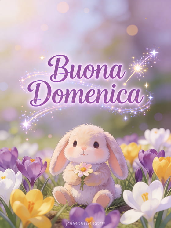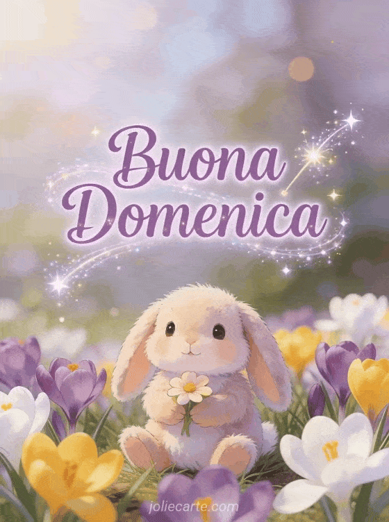 Illumina la domenica di qualcuno con questa adorabile cartolina con un tenero coniglietto circondato da crochi primaverili in una magica scena di risveglio. Scopri anche una cartolina immagini buona domenica, una cartolina buongiorno buona domenica baci o una cartolina buona domenica gif divertente.