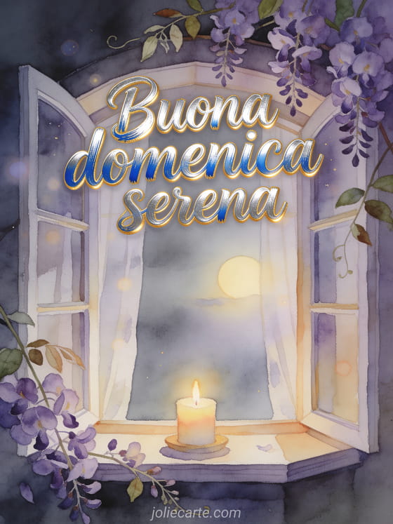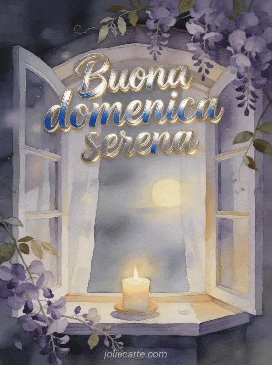 Condividi una buona domenica serena con una finestra a bovindo accogliente, un cielo grigio morbido fuori, una candela accesa dentro e violette che attraversano la cornice. Scopri anche buona domenica soleggiata gif, un buona domenica donna gif o buona domenica gif gratis.