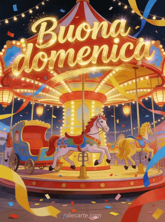 Invia buona domenica con una giostra da luna park sotto nastri luminosi e coriandoli, piena di luci scintillanti e colori festosi. Scopri anche cartolina animata buona domenica, buongiorno buona domenica immagine o buona domenica umorismo gif animata.