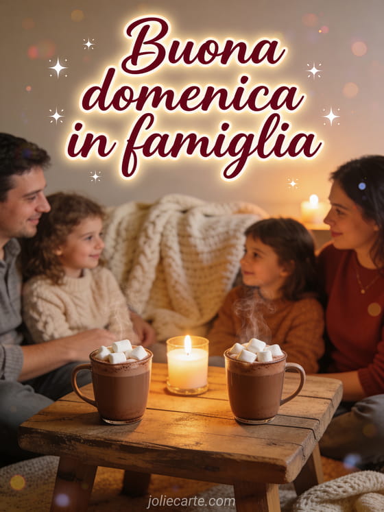 Condividi buona domenica in famiglia in una scena calda con scritte bordeaux, tazze fumanti di cioccolata calda, marshmallow, coperte morbide e luce di candela su un tavolo rustico. Scopri anche buongiorno domenica immagine o buona domenica amore mio baci.
