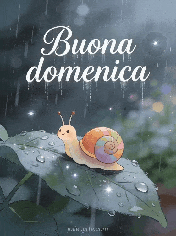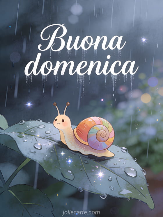 Condividi una domenica serena con questo biglietto delicato che mostra una tenera lumaca dal guscio colorato mentre avanza su una foglia bagnata coperta di gocce scintillanti. Scopri anche buona domenica immagine gratis, domenica benedetta o citazioni zen buona domenica.