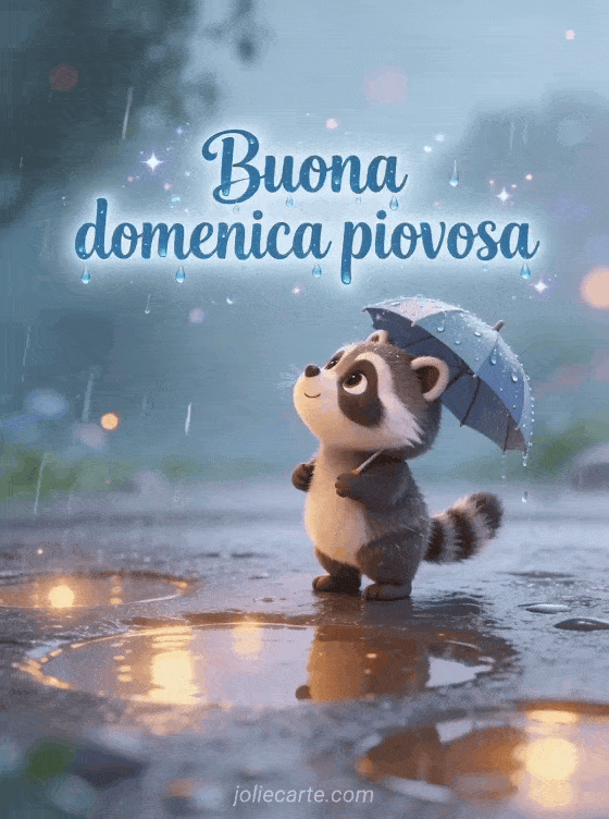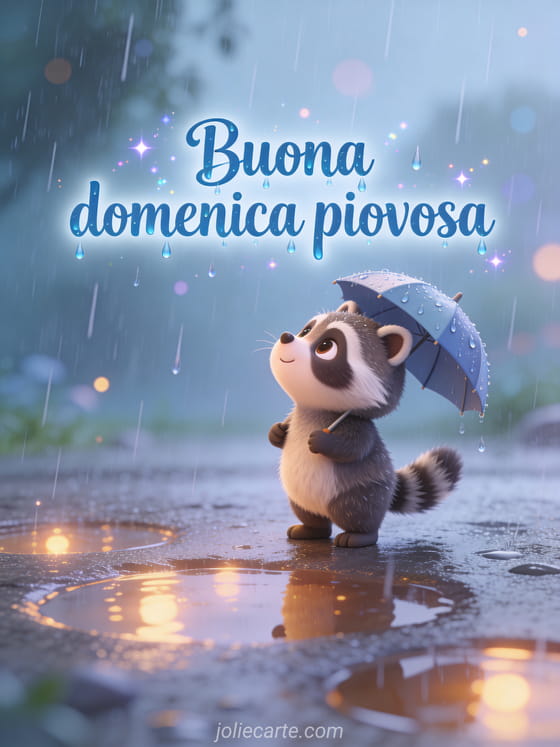 Condividi buona domenica piovosa con scritte azzurre morbide, effetto gocce di pioggia, un procione carino in stile cartone con un piccolo ombrello e pozzanghere che riflettono luci delicate. Scopri anche buona domenica gif animate o buongiorno domenica cartolina.