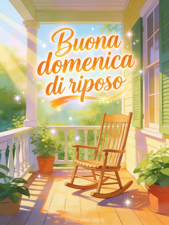 Invia un saluto di buona domenica di riposo con una sedia a dondolo vuota su una veranda, piante in vaso e raggi morbidi del sole del mattino. Scopri anche buona domenica citazione, buona domenica amicizia gif o buona domenica immagini gif animata.