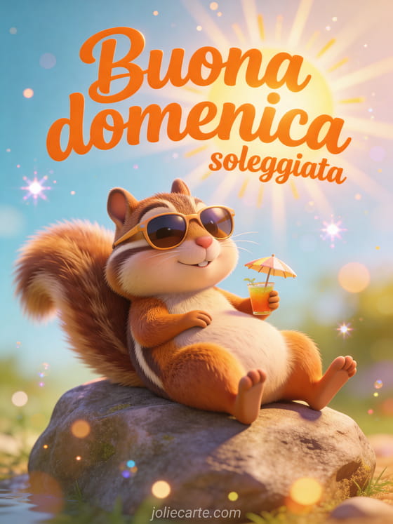 Condividi un'immagine di buona domenica soleggiata con scritte arancioni brillanti, uno scoiattolo striato in stile cartone che prende il sole su una roccia, occhiali da sole, un piccolo drink con ombrellino e atmosfera da vacanze estive. Scopri anche messaggio di buona domenica per un'amica o buona domenica biglietto gif.