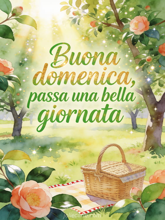 Condividi un saluto gioioso di domenica con calligrafia verde, bagliore dorato e un cestino da picnic in un frutteto pieno di sole. Questa cartolina gratuita augura una bella giornata, mentre camelie e foglie lucide aggiungono freschezza e festa. Scopri anche una immagine buona domenica invernale, una bella domenica o un messaggio di buona domenica.