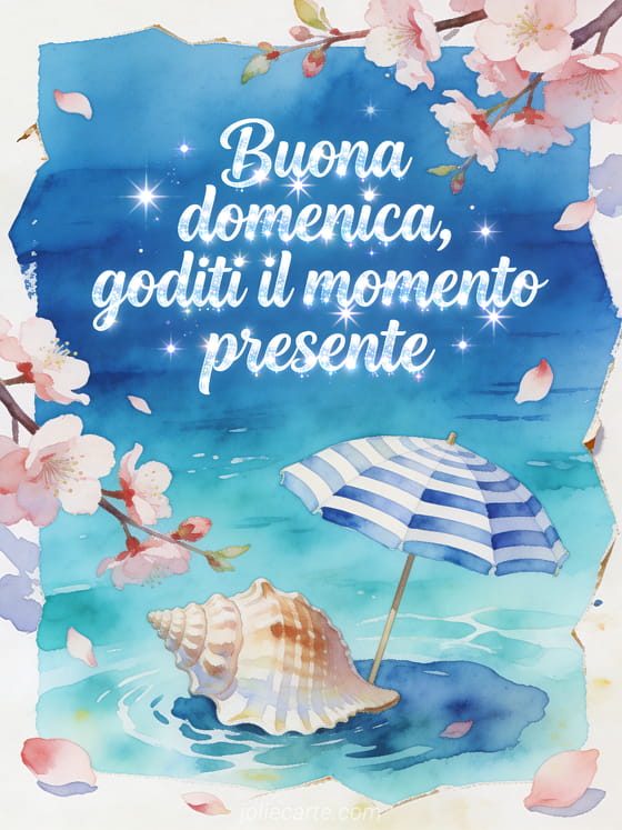 Invia un saluto gioioso di buona domenica con una conchiglia, un ombrellone a righe, acqua turchese e petali di fiore di ciliegio nella luce costiera. Scopri anche buona domenica a tutti immagini, buona domenica soleggiata immagini gratis o una immagine buona domenica invernale.