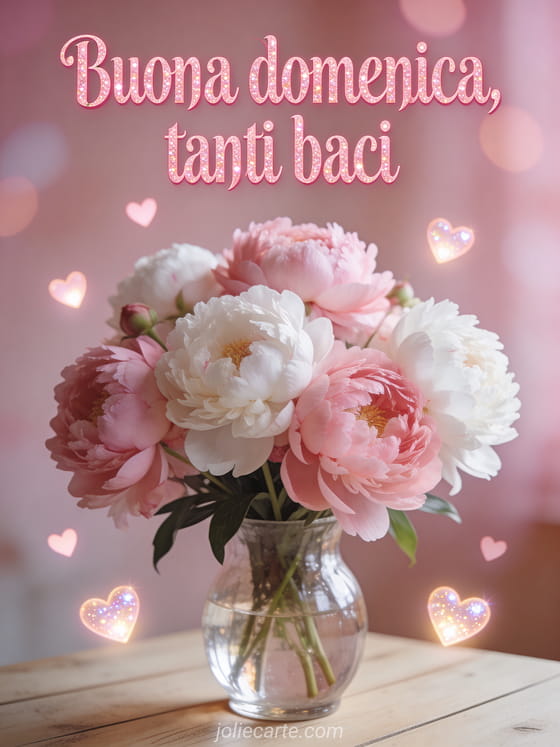 Condividi un saluto tenero di domenica con un bouquet generoso di peonie rosa e bianche in un vaso di vetro, cuori luminosi e luce rosata soffusa. Puoi anche inviare buona domenica paesaggio magnifico o buona domenica divertente gif.