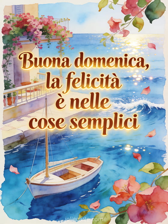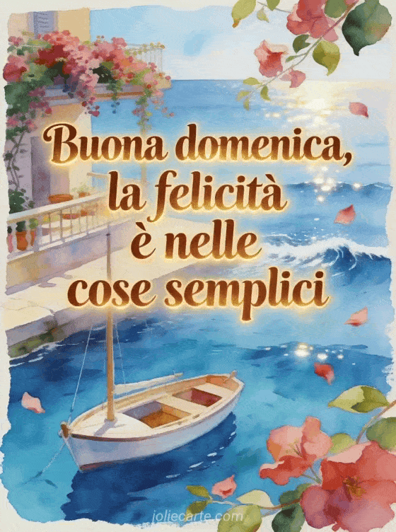 Condividi un pensiero luminoso della domenica con scritta castagna, una piccola barca a vela sull'acqua azzurra, una terrazza coperta di bouganville e il sole che scintilla sulle onde. Scopri anche una buona domenica cani immagine, una buona domenica cartolina virtuale animata o un domenica baci gif.