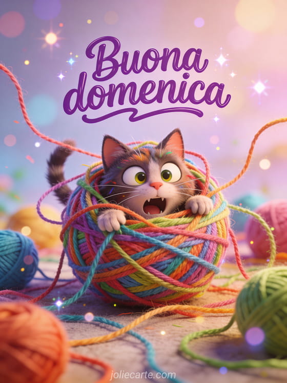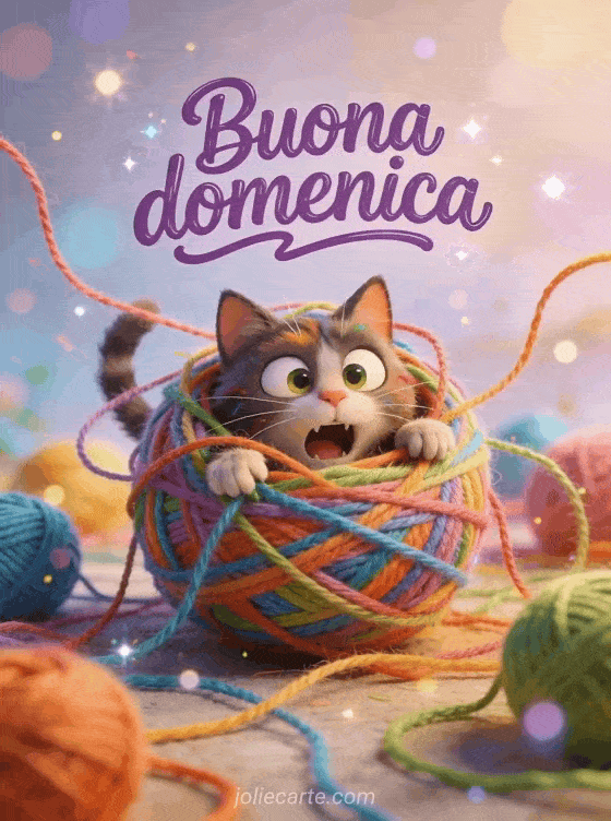 Condividi una gif animata di buona domenica umorismo con scritte viola stravaganti, un gatto rosso in stile cartone con occhi pazzi intrappolato in un caos di gomitoli e lana colorata ovunque. Scopri anche buona domenica e buona giornata o immagini animate buona domenica soleggiata.