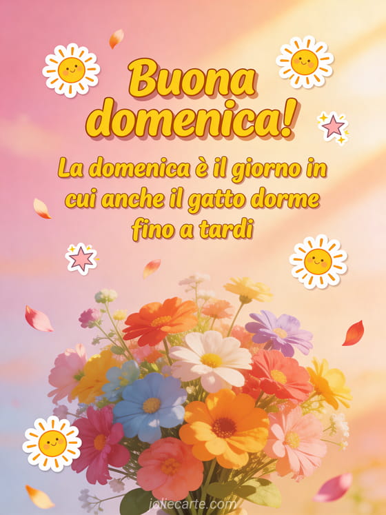Condividi una battuta gioiosa di buona domenica con scritte soleggiate, stelle giocose, un bouquet di fiori colorati e petali che fluttuano nella luce calda del pomeriggio. Scopri anche buona domenica immagini gratis, una bella immagine buongiorno domenica o buona domenica tanti baci gif.