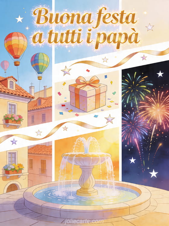 Festeggia tutti i papà con un biglietto illustrato e dettagliato con mongolfiere colorate sopra i tetti, una scatola regalo, una fontana luminosa e un cielo notturno con fuochi d'artificio. Questo design generoso e festivo è fatto per essere condiviso con tutti. Scopri anche festa del papà mi manchi, biglietto felice Festa del Papà o un modello di biglietto per la Festa del Papà.