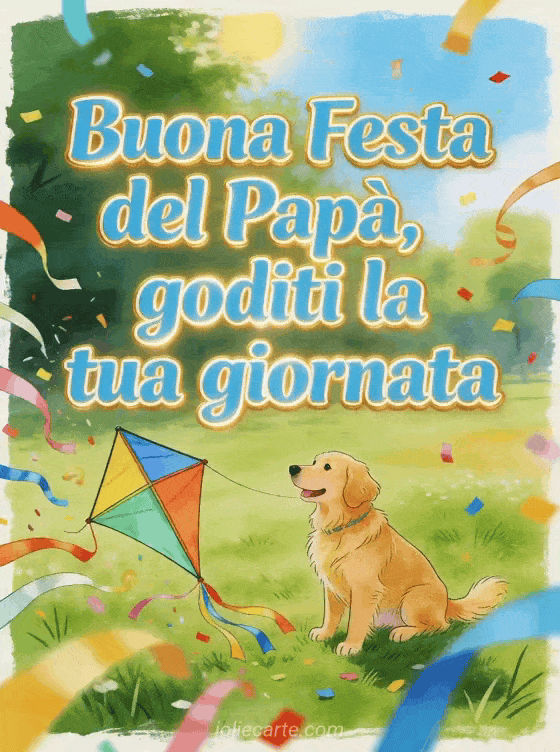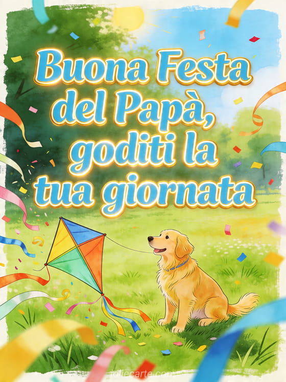 Invia buona Festa del PapĂ figlio mio con lettere azzurro cielo energiche, una gioiosa illustrazione a inchiostro di un golden retriever accanto a un aquilone colorato in un prato soleggiato, erba verde, nastri e coriandoli. Scopri anche amore Festa del PapĂ testo amore, poesia festa del papĂ il mio cuore mi dice o disegno festa del papĂ .