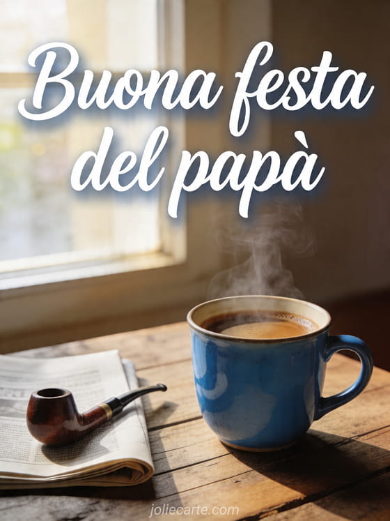 Condividi un'immagine di buona festa del papà con una tazza di caffè fumante, un giornale piegato e una luce dolce del mattino su un tavolo rustico in legno. Scopri anche un buona festa papà mamma, un'immagine festa del papà o un buongiorno buona festa del papà.