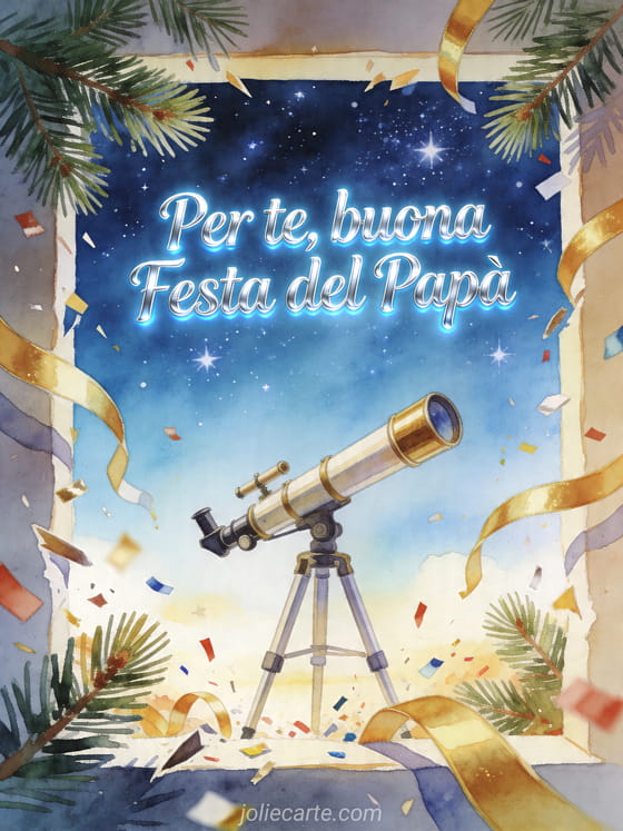 Invia buona festa del papĂ per mio figlio con lettere argento luminose, un'illustrazione gouache di un piccolo telescopio sotto un cielo stellato estivo, rametti di pino, stelle filanti dorate e coriandoli festivi. Scopri anche un'immagine gratis festa del papĂ , un bel biglietto per la Festa del PapĂ o buona festa del papĂ a tutti i papĂ .