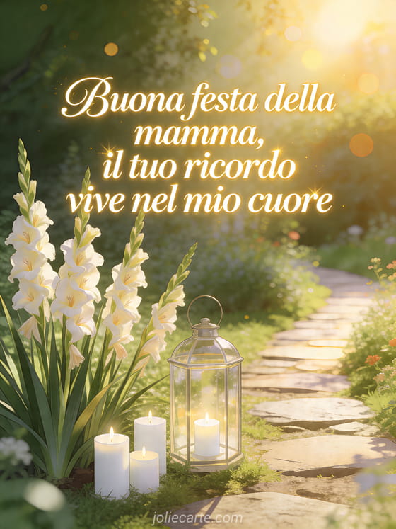 Onora una mamma amata con un biglietto sereno per la festa della mamma, dove il suo ricordo vive nel cuore tra gladioli, candele e dolce luce di giardino. Scopri anche un biglietto festa della mamma, immagini gratuite festa della mamma o un festa della mamma testo.