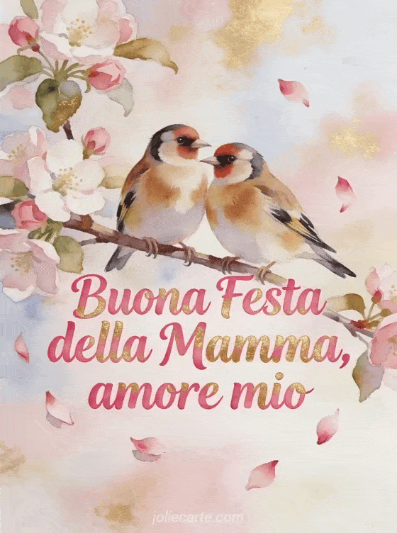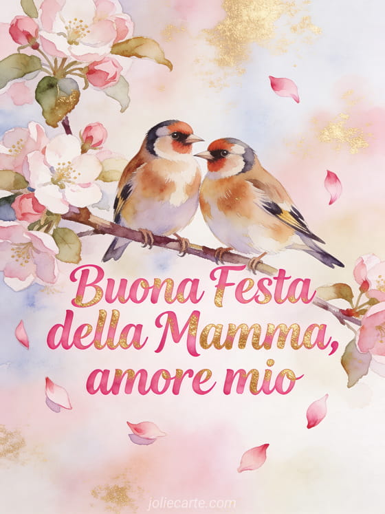 Condividi questo incantevole biglietto in acquerello con due cardellini su fiori di melo e petali rosa che cadono. Scopri anche immagini buona festa della mamma o cartoline festa della mamma.