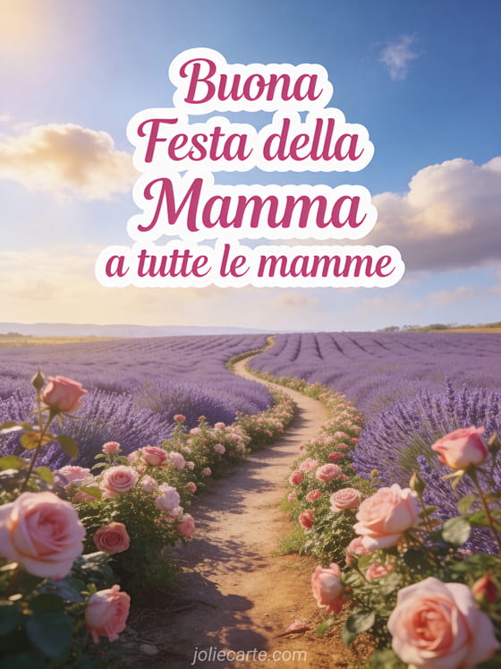 Festeggia tutte le mamme con questo tranquillo biglietto con campo di lavanda e luce primaverile dorata. Scopri anche messaggio buona festa della mamma o immagine festa di mamma.