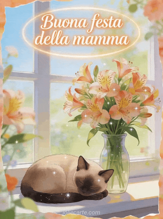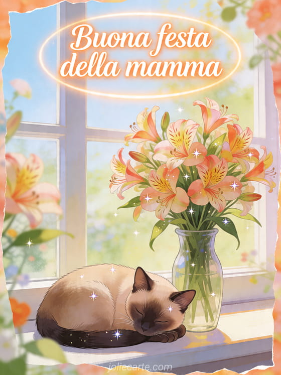 Condividi un biglietto caldo per la festa della mamma con un gatto siamese accoccolato, alstroemerie fresche e un luminoso davanzale pieno di luce primaverile. Scopri anche un messaggio per la festa della mamma, citazioni sulla festa della mamma o messaggi sulla festa della mamma.