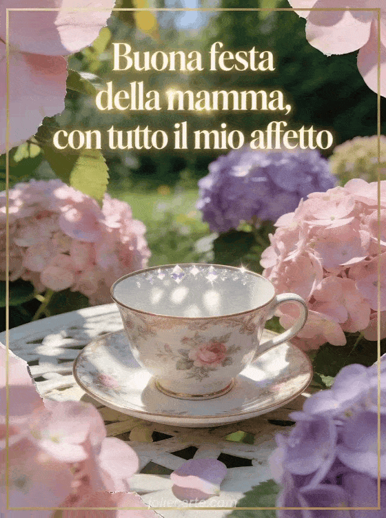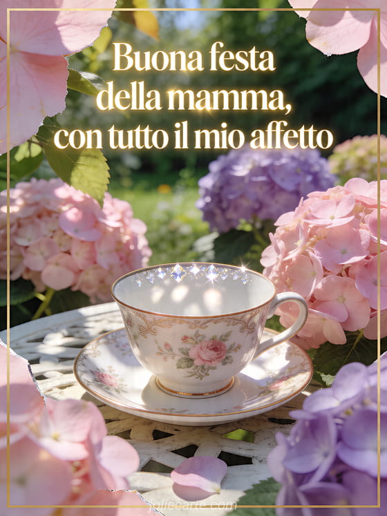 Invia buona festa della mamma suocera con lettere champagne raffinate, luce delicata e una tazza in porcellana fotorealistica circondata da ortensie su un tavolo da giardino al sole. Questo biglietto affettuoso è fresco, elegante e luminoso. Scopri anche festa della mamma per mia figlia, testo per la festa della mamma o poesie per la festa della mamma.