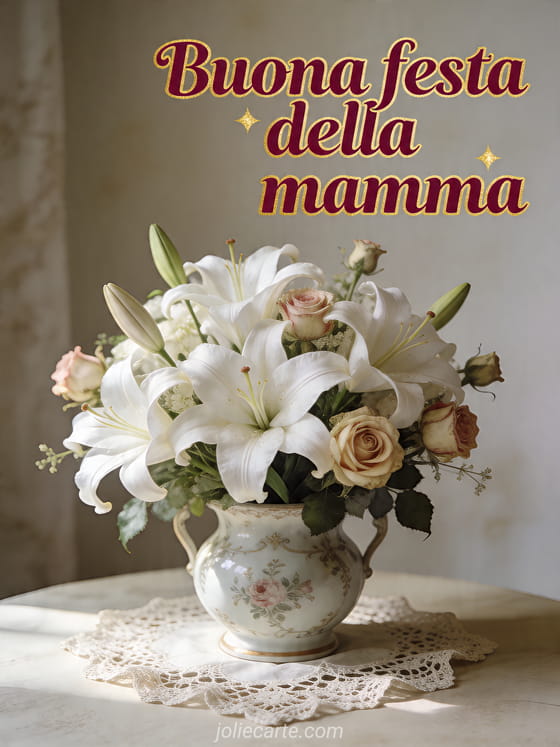 Offri un augurio classico ed elegante con un bouquet di gigli bianchi e rose antiche in un vaso di porcellana su una tovaglia di pizzo. Puoi inviare anche festa della mamma, disegni festa della mamma o versi per la festa della mamma.