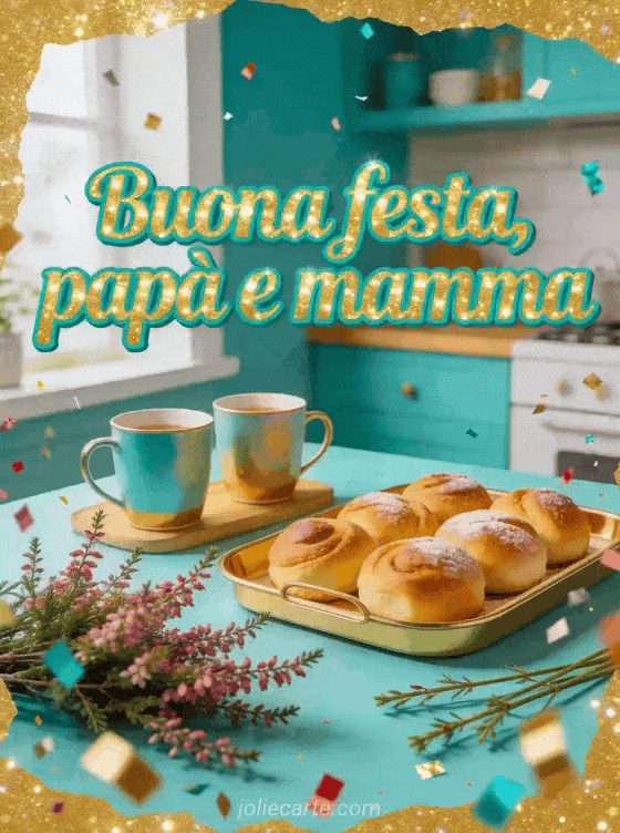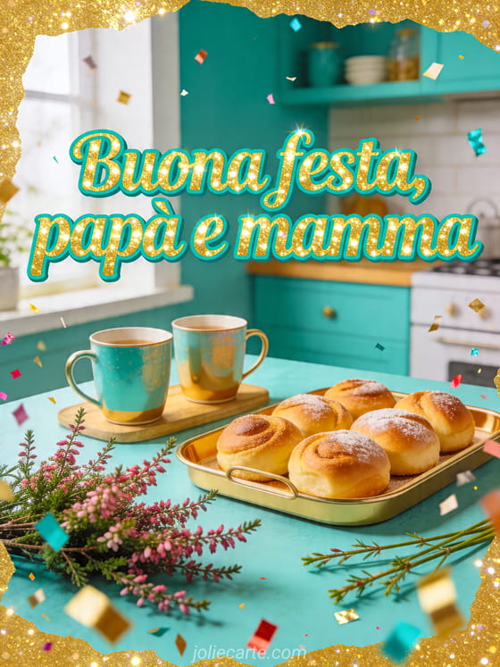 Condividi un biglietto illustrato e accogliente per papà e mamma con due tazze abbinate, un vassoio di brioche e rametti di erica che superano il bordo dell'immagine. Questo design equilibrato e affettuoso è perfetto per celebrare entrambi. Scopri anche buona festa del papà per mio figlio, immagine gratis festa del papà o un bel biglietto per la Festa del Papà.