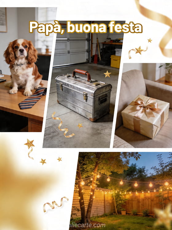 Festeggia papĂ con un biglietto realistico e gioioso in stile collage, con un cane Cavalier King Charles accanto a una cravatta, una cassetta degli attrezzi, un regalo e un angolo di giardino con luci calde. Un pensiero vicino per la Festa del PapĂ . Scopri anche biglietto festa del papĂ camicia, un biglietto originale per la Festa del PapĂ o biglietti festa del papĂ .