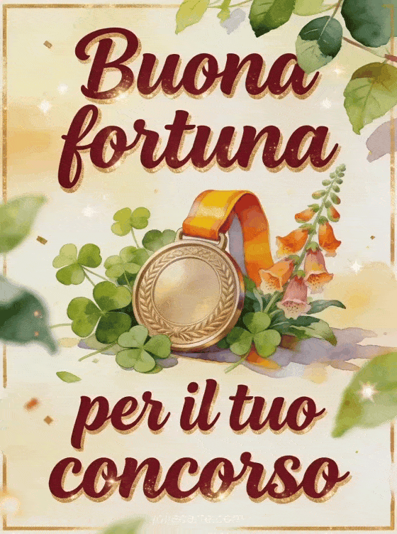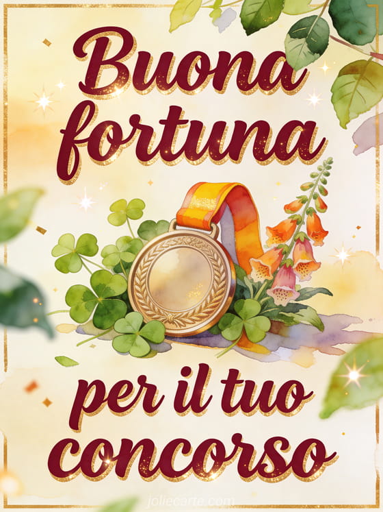 Condividi un biglietto motivante di buona fortuna con una medaglia luminosa, nastro, quadrifogli portafortuna, digitali e foglie fresche in una scena festosa ad acquerello. Puoi anche inviare una buona fortuna gif animata gratis, un buona fortuna per i tuoi esami gif o una buona fortuna esame gif animate gif.