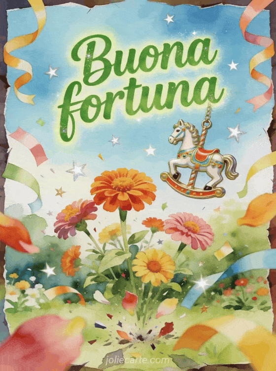 Augura buona fortuna con un brillante portafortuna a forma di cavallo da giostra, fiori di zinnia, stelle filanti di carta e coriandoli a stella in un giardino gioioso. Puoi inviare anche una buona fortuna per i tuoi esami gif, una buona fortuna esame gif animate gif o cartoline virtuali buona fortuna.