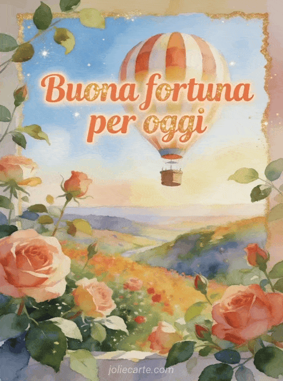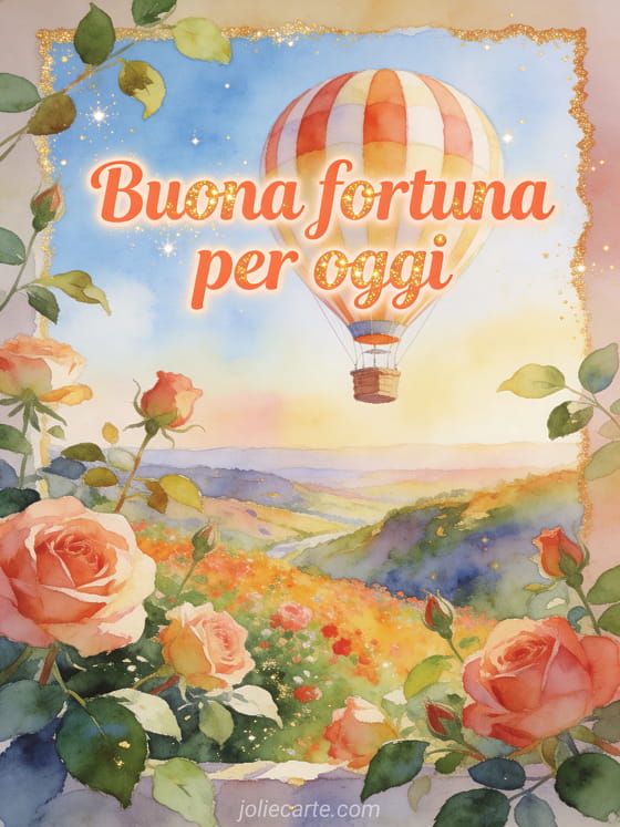 Augura buona fortuna per oggi con una mongolfiera ad acquerello sopra una valle vivace, rose antiche, foglie verdi delicate e un cielo luminoso. Puoi condividere anche buona fortuna immagine gif, messaggio di buona fortuna per esame o buona fortuna per trovare colleghi migliori di noi biglietto.