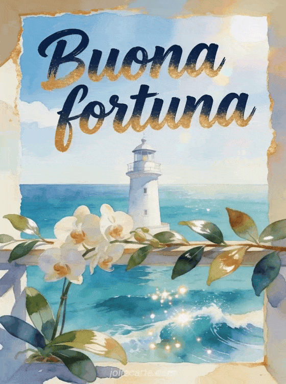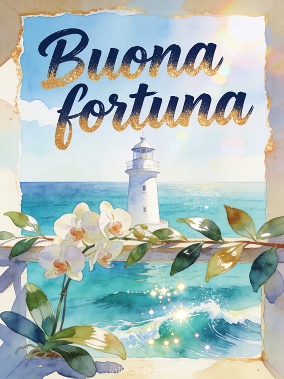 Augura buona fortuna con un faro bianco sopra un mare turchese luminoso, orchidee oltre il bordo, onde al sole e riflessi scintillanti. Scopri anche messaggio per augurare buona fortuna a un esame, messaggio di buona fortuna per un nuovo lavoro o buona fortuna gif animata.