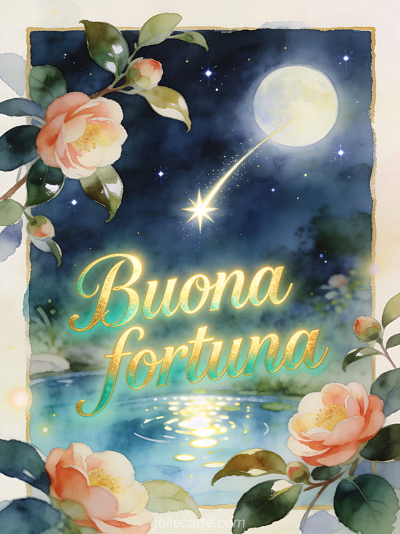 Condividi un augurio di buona fortuna con una stella cadente sopra uno stagno limpido al chiaro di luna, riflessi luminosi, camelie e foglie lucide. Scopri anche una buona fortuna per domani immagine, auguri di buona fortuna o buona fortuna immagini gratis.