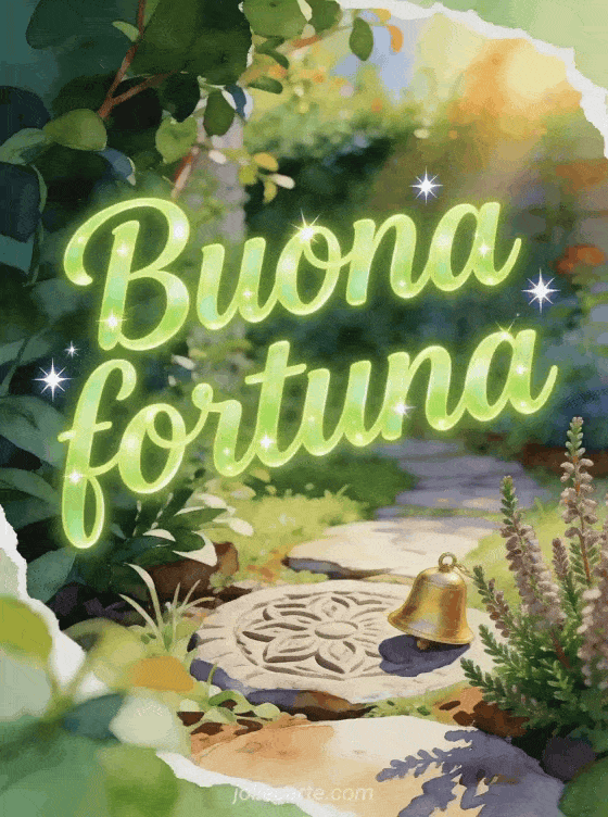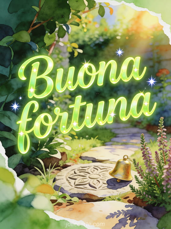 Condividi un biglietto luminoso di buona fortuna con un sentiero di pietra intagliato, una piccola campanella dorata, rametti di erica e luce calda del sole. Puoi anche inviare e poi soprattutto buona fortuna gif, una foto animata buona fortuna o buona fortuna a tutti immagine.