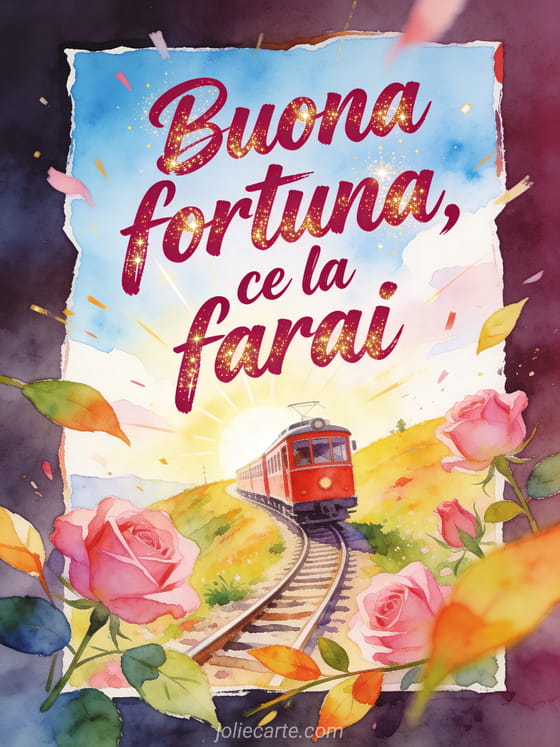 Incoraggia qualcuno con una cartolina di buona fortuna in cui un trenino rosso sale su una collina soleggiata, incorniciato da rose e foglie luminose. Scopri anche un biglietto di buona fortuna gratuito, un biglietto di buona fortuna o un buona fortuna per il tuo esame testo.
