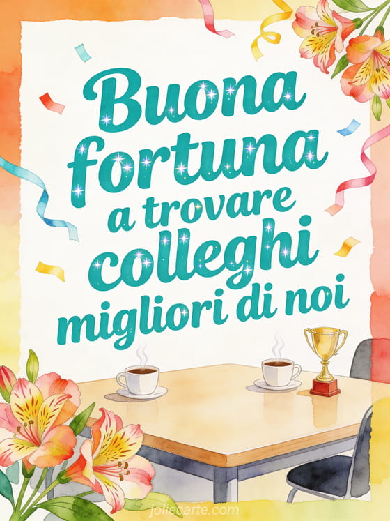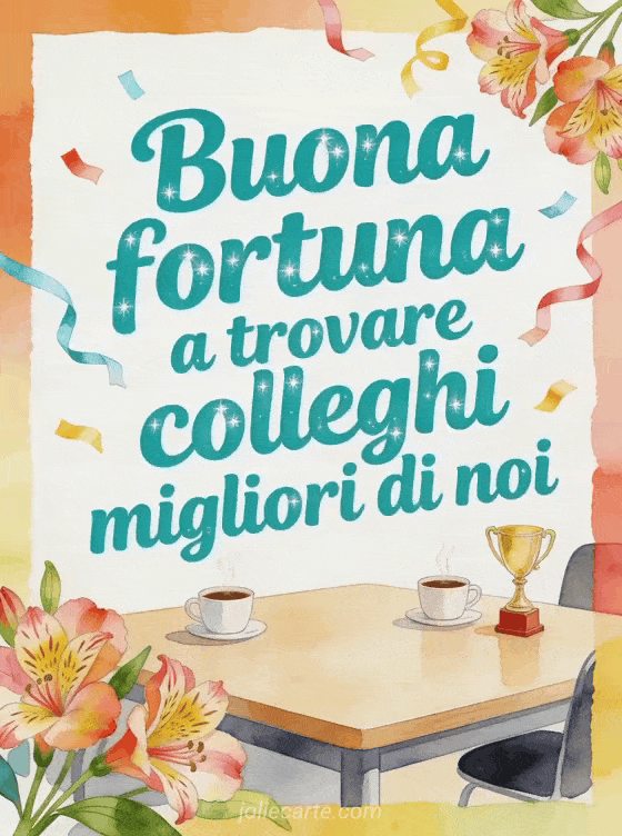 Condividi un addio giocoso con una luminosa sala pausa, tazze di caffè fumanti, un piccolo trofeo, stelle filanti di carta e alstroemerie. Scopri anche buona fortuna gif, arrivederci e buona fortuna biglietto o testo per augurare buona fortuna.