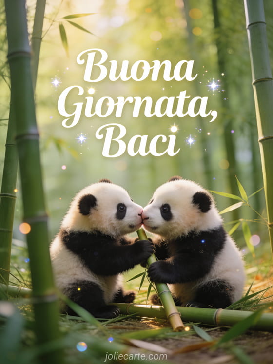 Illumina la giornata di qualcuno con questo tenero biglietto di buona giornata con adorabili cuccioli di panda che giocano con il bambù e si scambiano un dolce bacio. Scopri anche un biglietto di buona giornata con sole o un biglietto di buona giornata con baci.