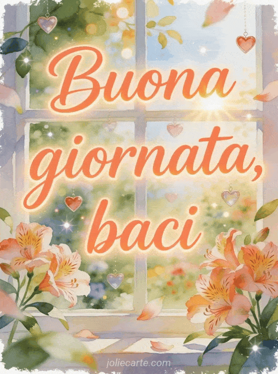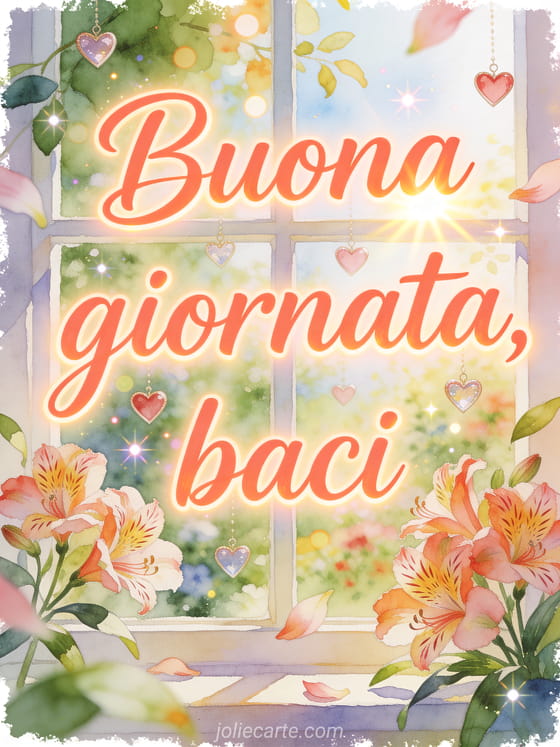 Condividi buona giornata e baci in una luminosa finestra sul giardino ad acquerello, con fiori di alstroemeria, cuori sospesi e foglie al sole. Puoi condividere anche buongiorno buona giornata gif animata gif animata, buona giornata anche gif o buona giornata fata gif.