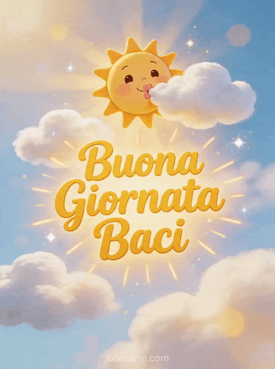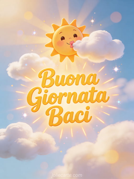 Rallegra la giornata di qualcuno con questo divertente biglietto con un simpatico sole che manda baci in un allegro cielo mattutino. Scopri anche un biglietto di buona giornata con baci o un biglietto animato di buongiorno.