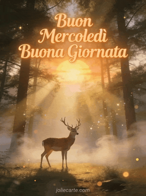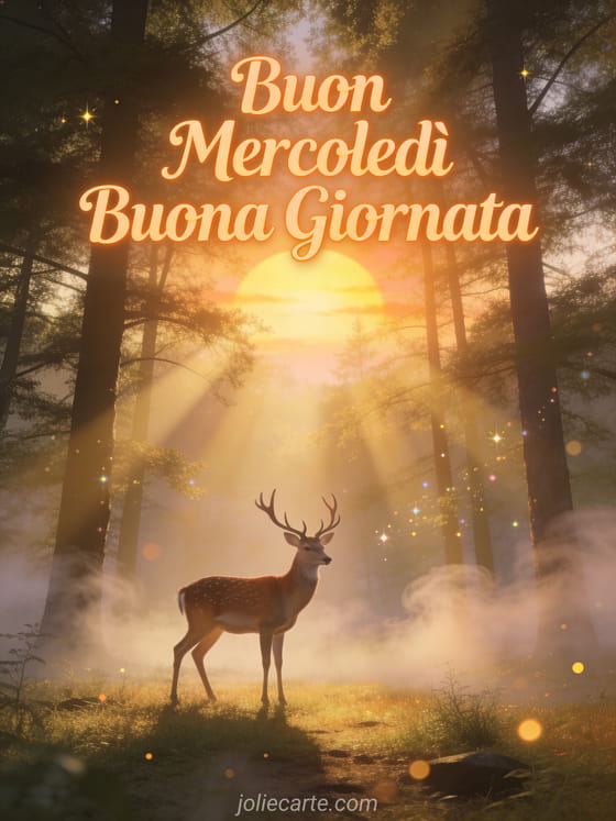 Condividi un caloroso augurio di buon mercoledì con questo incantevole biglietto con un maestoso cervo nella foresta. Scopri anche immagini baci del mercoledì o buongiorno buon mercoledì caffè per altra ispirazione a metà settimana.