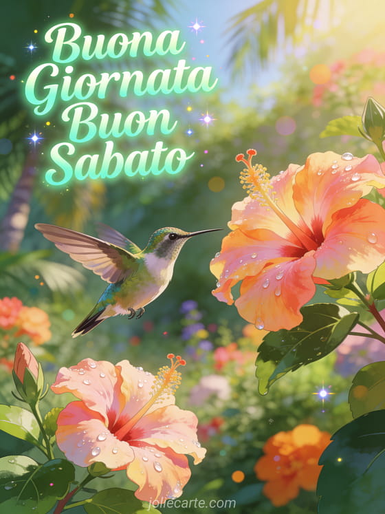 Invia un gioioso saluto di sabato con un bellissimo colibrì che vola presso fiori di ibisco in un giardino tropicale. Un modo vivace per augurare un meraviglioso sabato. Scopri anche una cartolina allegra di sabato o una cartolina sabato con umorismo.