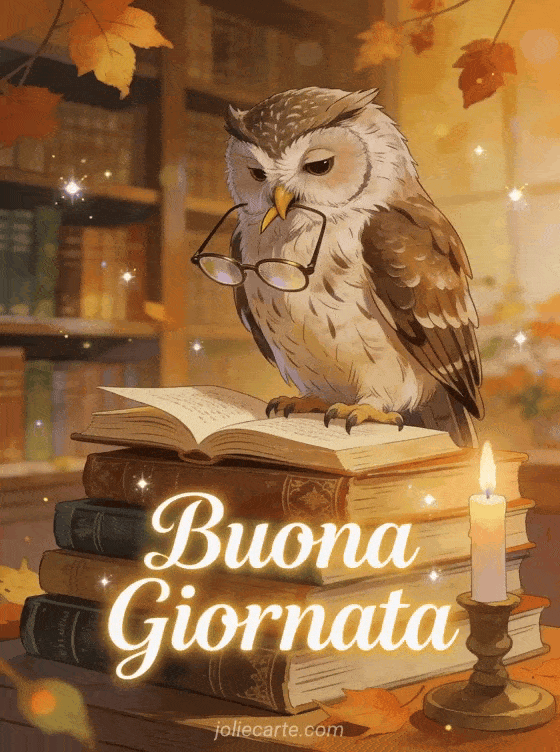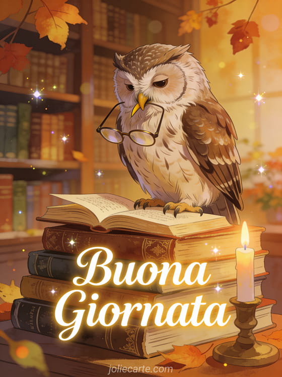 Invia questa incantevole buona giornata con un gufo saggio seduto su libri antichi con gli occhiali da lettura in una biblioteca autunnale. Scopri anche una cartolina baci buona giornata caffè immagine o una cartolina buona giornata immagine.