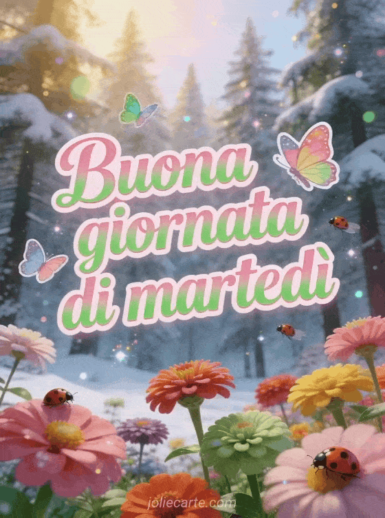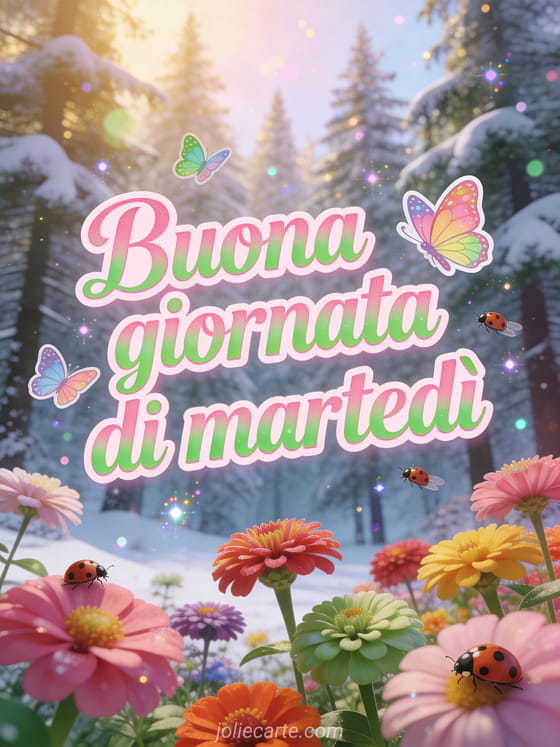 Invia un biglietto colorato di buona giornata di martedì con lettere rosa primaverili, tocchi verdi, farfalle e coccinelle, dove zinnie multicolori fioriscono davanti a una foresta di abeti innevata in una transizione magica tra inverno e primavera. Scopri anche buon martedì baci immagini gratis, immagine buon martedì baci o buon martedì umorismo immagine.